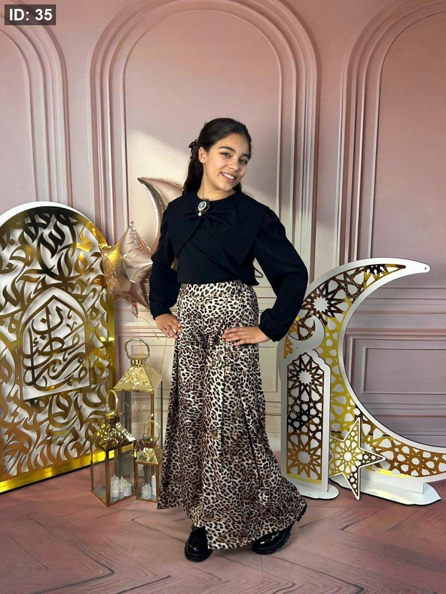 طقم بناتي أنيق يجمع بين بلوزة سوداء بتصميم كلاسيكي راقٍ مع ياقة عريضة ولمسة بروش ذهبية فاخرة، وتنورة طويلة بنقشة ليوبارد عصرية تضيف حضور قوي ومميز.