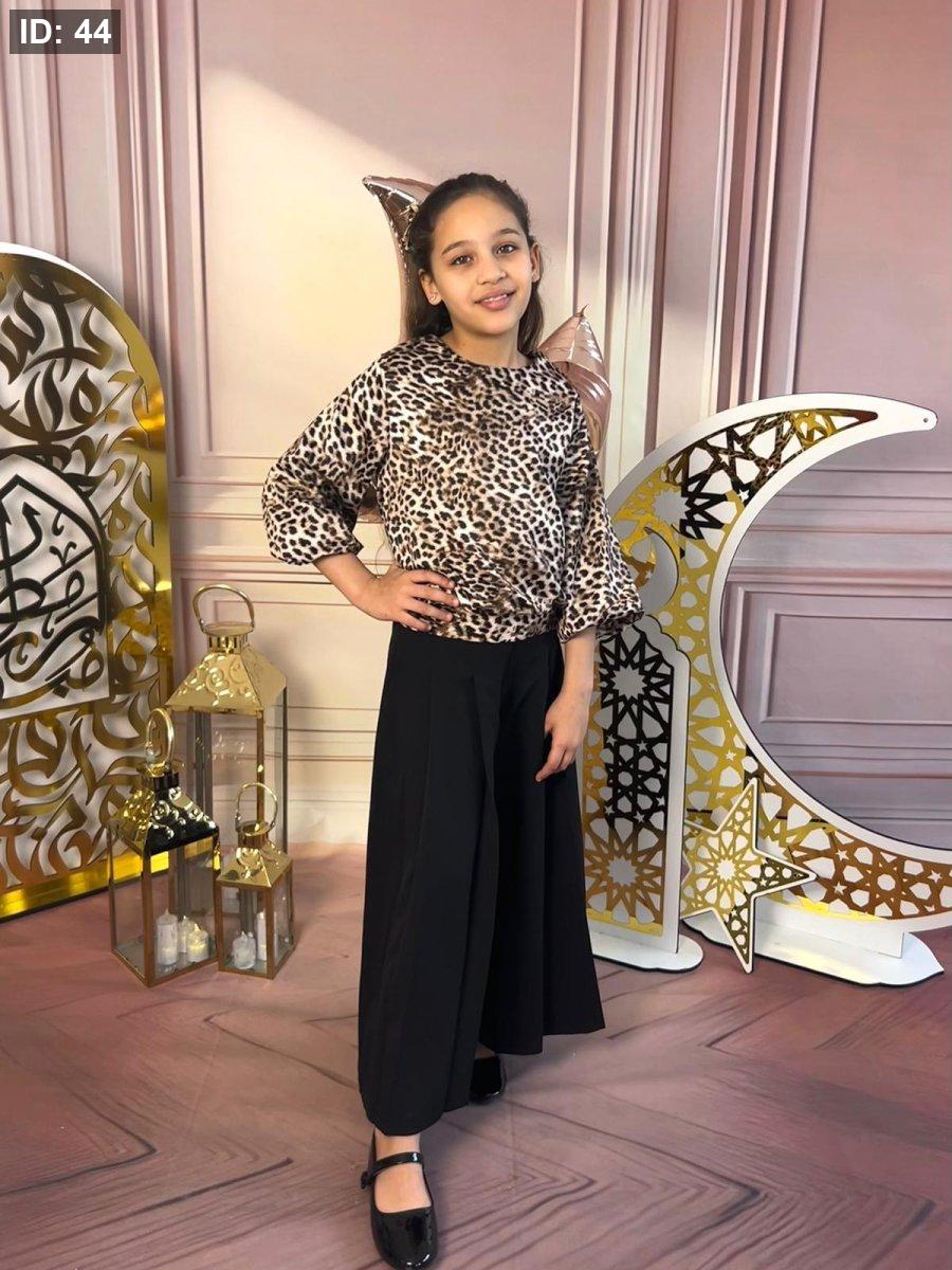 طقم بناتي عصري يجمع بين بلوزة بنقشة ليوبارد الجريئة بتصميم ناعم وأكمام مريحة، مع تنورة سوداء واسعة بقصة أنيقة تعطي حركة وانسيابية جميلة.