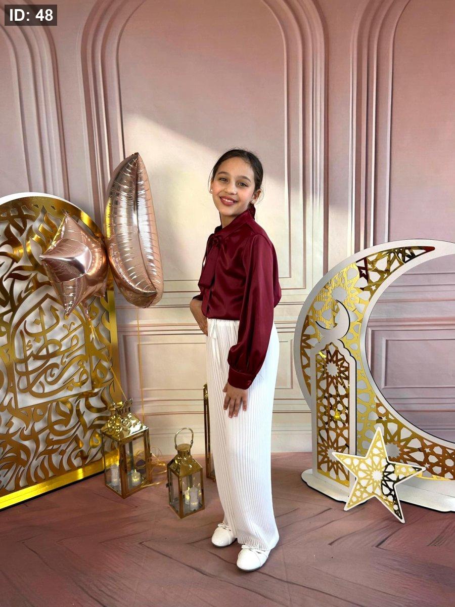 طقم بناتي رسمي يتكوّن من بلوزة عنابية بأكمام طويلة مع ربطة أنيقة عند الرقبة، وبنطال أبيض واسع بقصة عصرية.