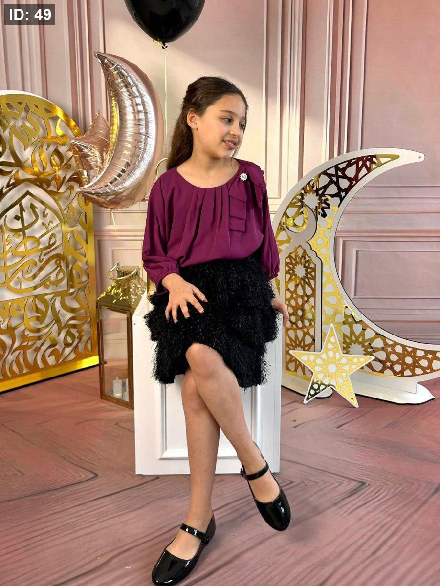 طقم بناتي رسمي يتكوّن من بلوزة عنابية بأكمام طويلة مع تفاصيل أنيقة عند الصدر، وتنورة سوداء منفوشة بتصميم مميز.