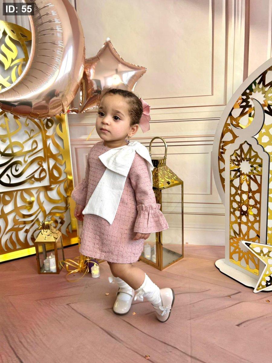فستان بيبي وردي أنيق بتصميم راقي مناسب للأعياد، المناسبات العائلية، وجلسات التصوير. يتميز بقماش ناعم ومريح على بشرة الأطفال مع فيونكة جانبية بيضاء كبيرة تضيف لمسة فخامة خاصة.