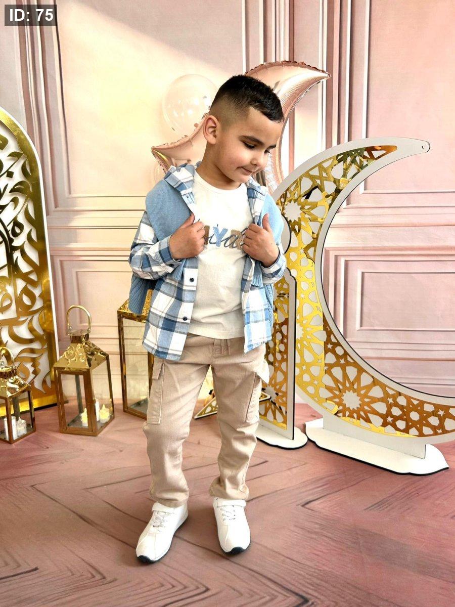 طقم ولادي كاجوال عصري يتكوّن من قميص كاروهات أزرق بتصميم مريح مع تيشيرت داخلي ناعم، وبنطلون بيج عملي مناسب للحركة اليومية.